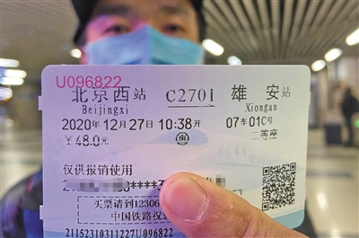 12月26日,市民展示购得12月27日北京西站至雄安站C2701次列车车票。记者 王贵彬 摄
