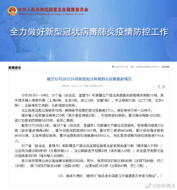 截至12月26日24时,据31个省(自治区、直辖市)和新疆生产建设兵团报告,现有确诊病例334例(其中重症病例4例),累计治愈出院病例81987例,累计死亡病例4634例,累计报告确诊病例86955例,无现有疑似病例。累计追踪到密切接触者900952人,尚在医学观察的密切接触者11954人。