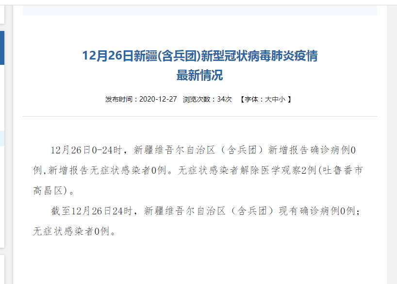 截至12月26日24时,新疆维吾尔自治区(含兵团)现有确诊病例0例;无症状感染者0例。