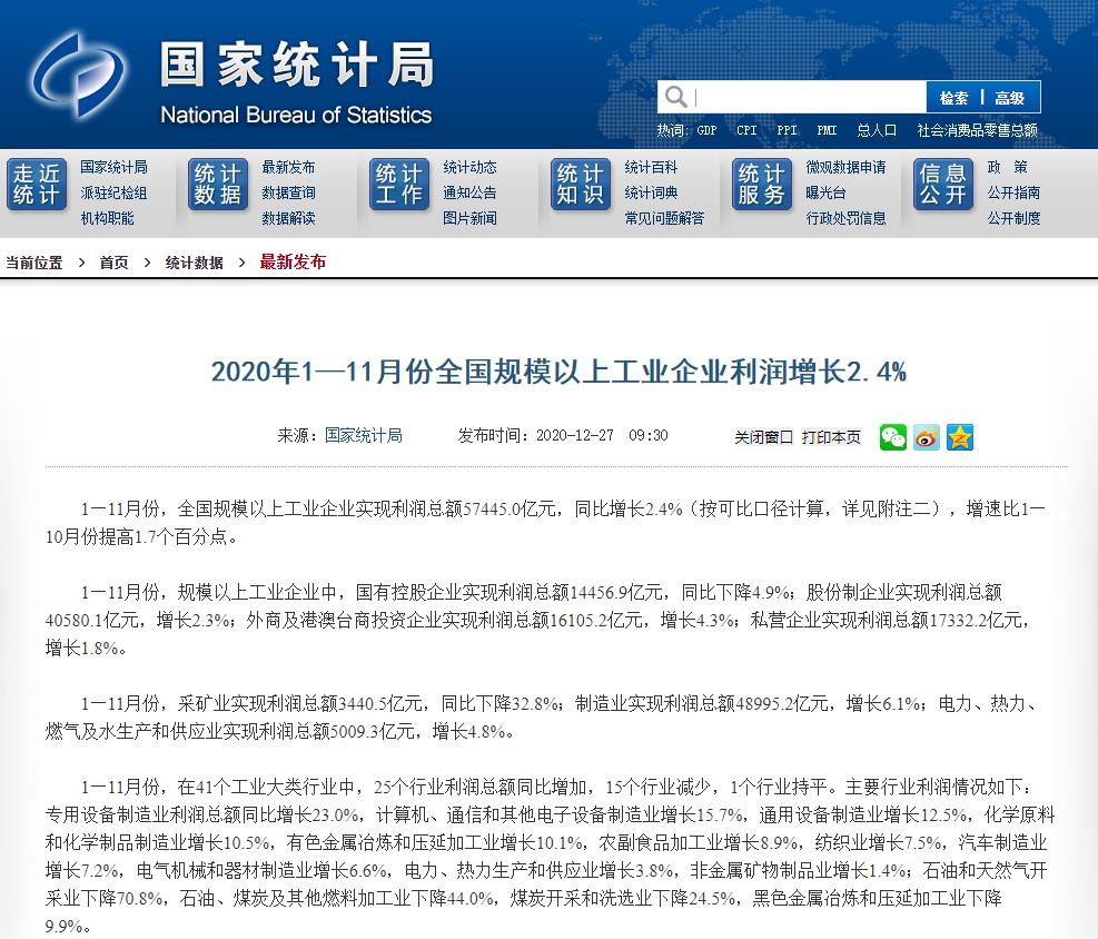 国家统计局今天(27日)公布数据显示,1—11月份,全国规模以上工业企业实现利润总额57445.0亿元,同比增长2.4%,增速比1—10月份提高1.7个百分点。在41个工业大类行业中,25个行业利润总额同比增加,15个行业减少,1个行业持平。 详情>>