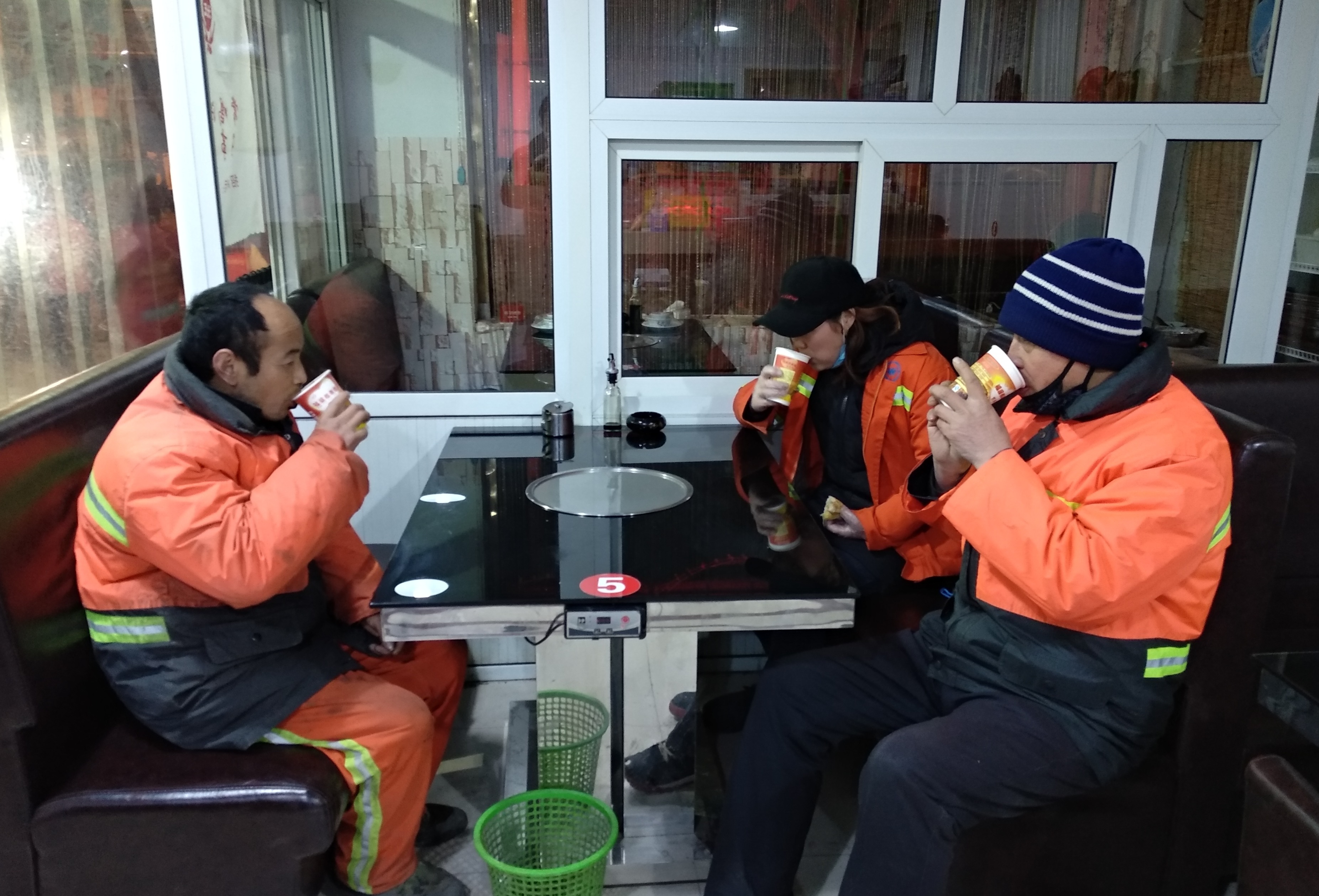 12月27日,在河北省武安市塔西路的爱心奉粥站,环卫工人在店内喝粥休息。
