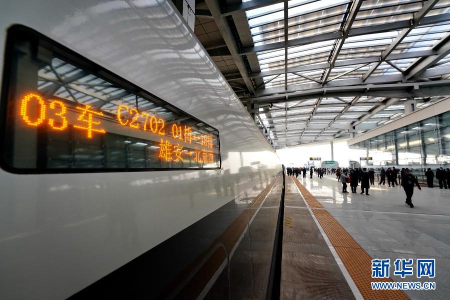 12月27日,从雄安开往北京西的首发列车停靠在雄安站站台。新华社记者 牟宇 摄