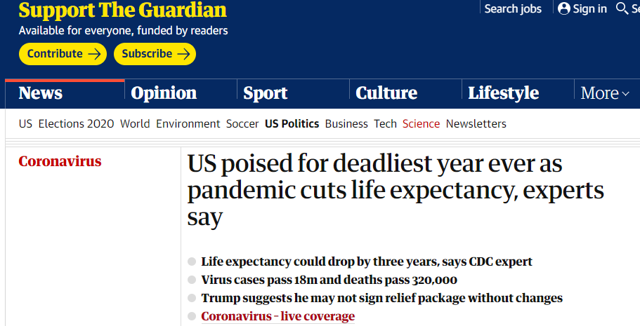 △专家称,由于新冠疫情的大流行会削减人均寿命,2020年或将成为美国最致命的一年。(图片来源:《卫报》)