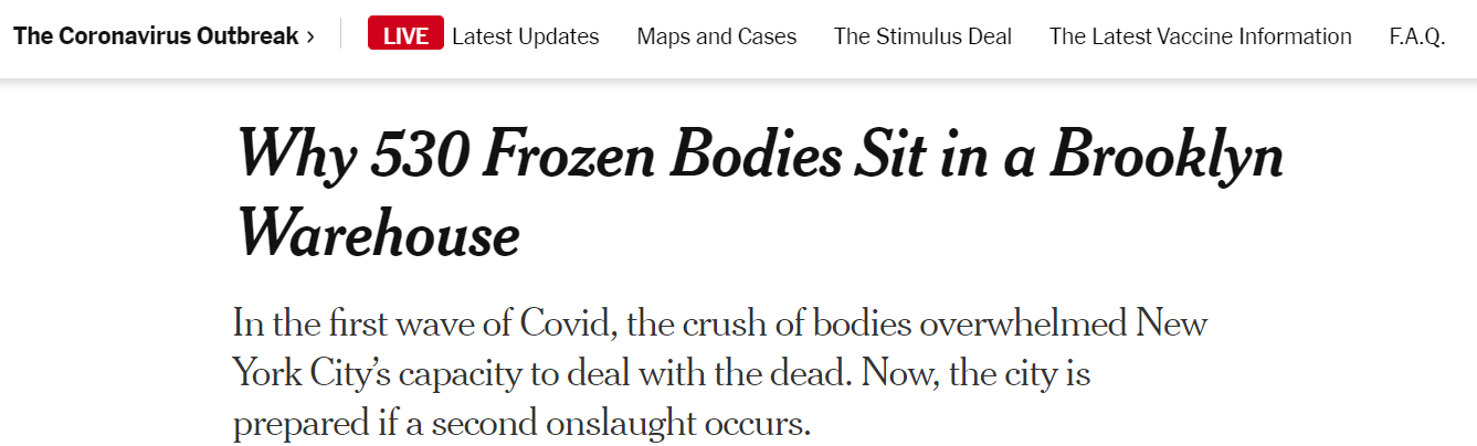 △当地时间26日,《纽约时报》发表题为《为什么布鲁克林的仓库里装满了530具尸体》的文章。(图片来源:《纽约时报》)