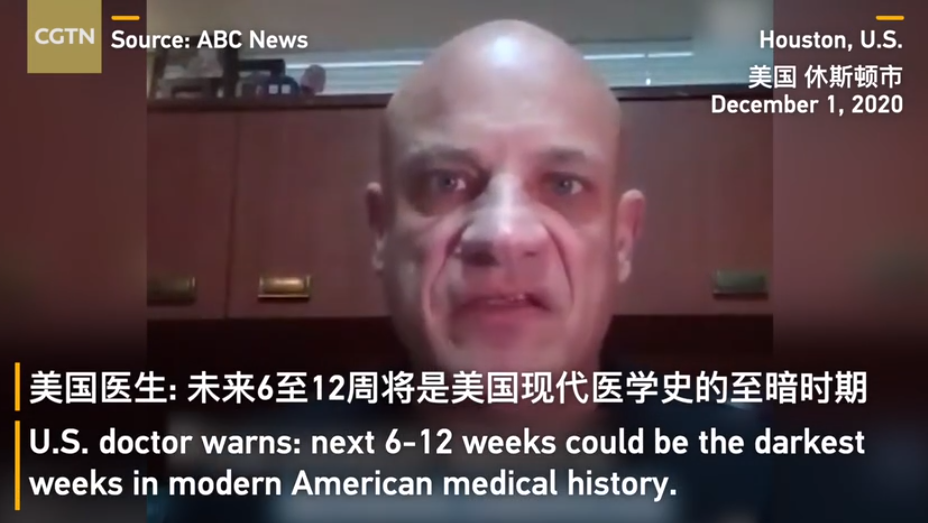 就在本月初,休斯敦联合纪念医疗中心首席医疗官约瑟夫·瓦龙在接受采访时称:“接下来的六周将是美国现代医学史上的至暗时刻。我们正处于传统假期,而人们(对防疫规定)听不进去。”