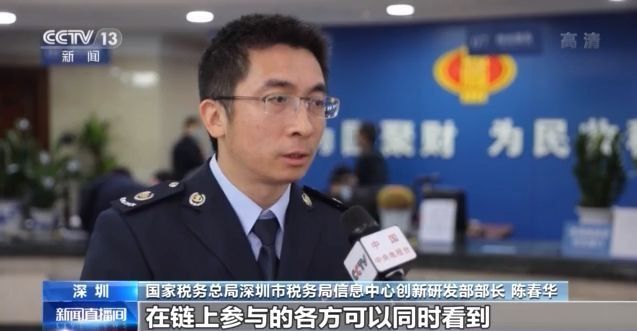 国家税务总局深圳市税务局信息中心创新研发部部长 陈春华:纳税人的涉税数据上链之后,在链上参与的各方可以同时看到。假如说有一方要进来进行数据修改的话,其他的几方发现数据被篡改之后,就可以立即还原,进一步确保了数据的安全性和准确性。