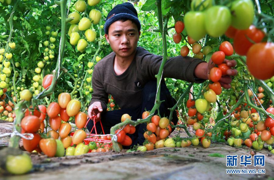 12月27日,在甘肃省敦煌市转渠口镇雷家墩村生态农业园区,农民在日光温室里采摘圣女果。