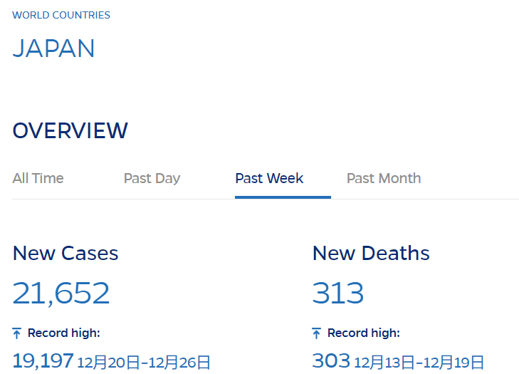 △日本第三拨疫情相较前两拨影响更加严重,自12月20日至12月26日这一周,平均单日新增确诊病例达到21652例(数据来源:美国约翰斯·霍普金斯大学)