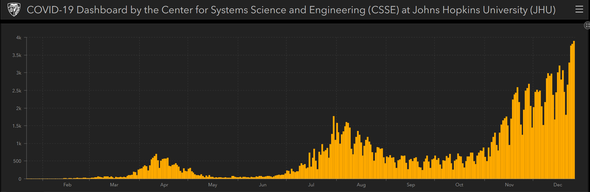 △2月14日至12月27日,日本新冠肺炎单日新增确诊数统计图。根据上图显示,日本自2月起经历了三拨疫情,而这三拨疫情的剧烈程度逐渐加深。(图片来源:美国约翰斯·霍普金斯大学)