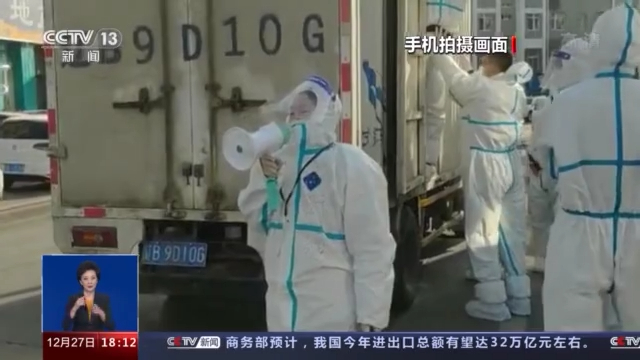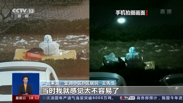 两张照片分别是白天和黑夜,不同的色调里,同一个背影,身穿防护服,坐在居民楼前,身旁的地上还残留有积雪。拍摄这两张照片的是金润小区的居民王先生和他的妻子。受疫情影响,金润小区从12月19日开始进行封闭管理,社区工作人员和志愿者同时入驻开展各项居民服务工作。