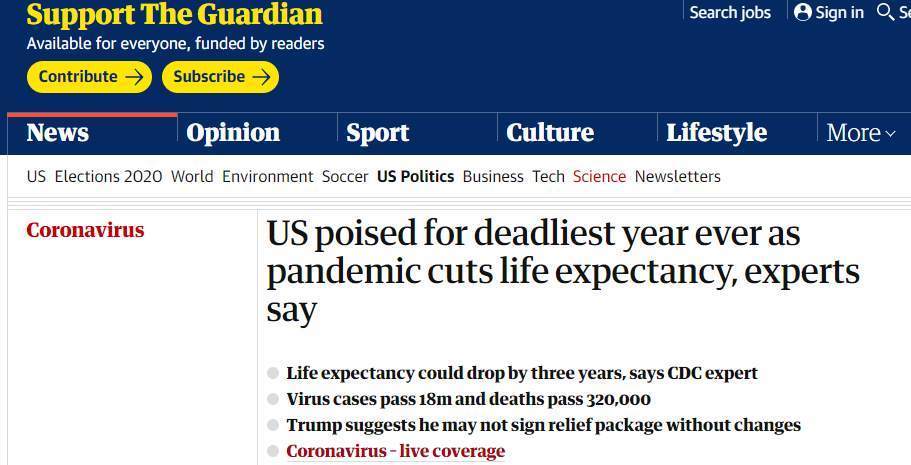 △专家称,由于新冠疫情的大流行会削减人均寿命,2020年或将成为美国最致命的一年。(图片来源:《卫报》)