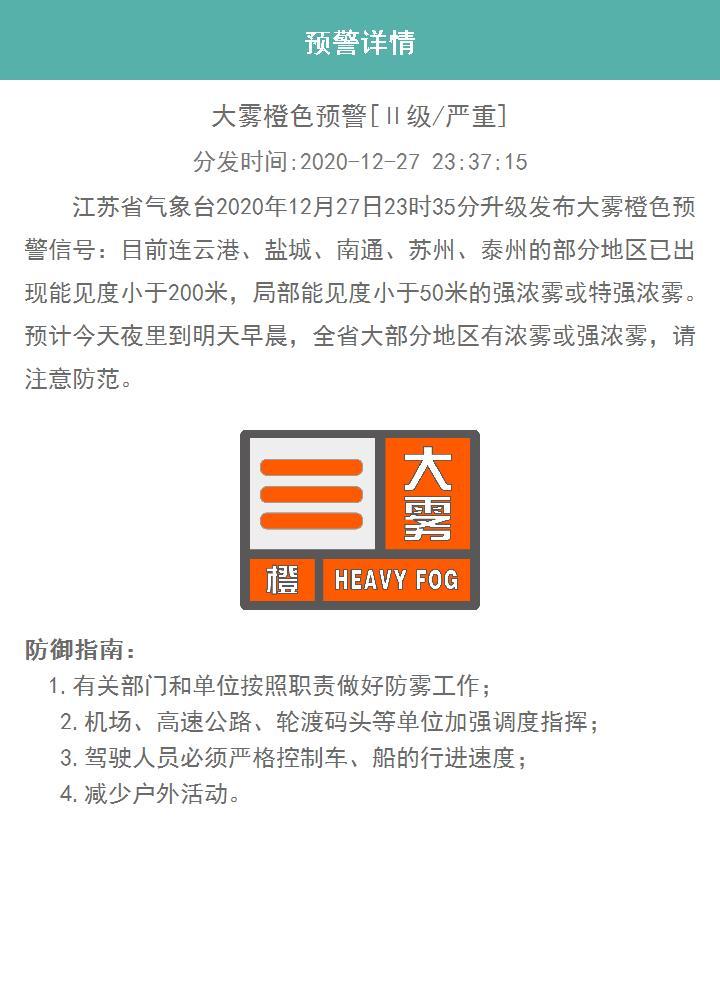 江苏省气象台2020年12月27日23时35分升级发布大雾橙色预警信号:目前连云港、盐城、南通、苏州、泰州的部分地区已出现能见度小于200米,局部能见度小于50米的强浓雾或特强浓雾。预计今天夜里到明天早晨,全省大部分地区有浓雾或强浓雾,请注意防范。(总台央视记者 黄成)