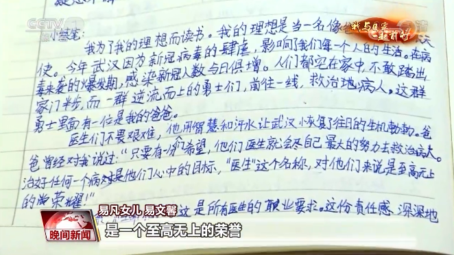 12月16日,易凡女儿的老师给孩子们布置了一篇作文,题目叫作为什么而读书。过去一直希望长大当一个明星的女儿,这一次却在作文里写道,希望好好读书,长大以后能够成为一名像爸爸一样的医生。