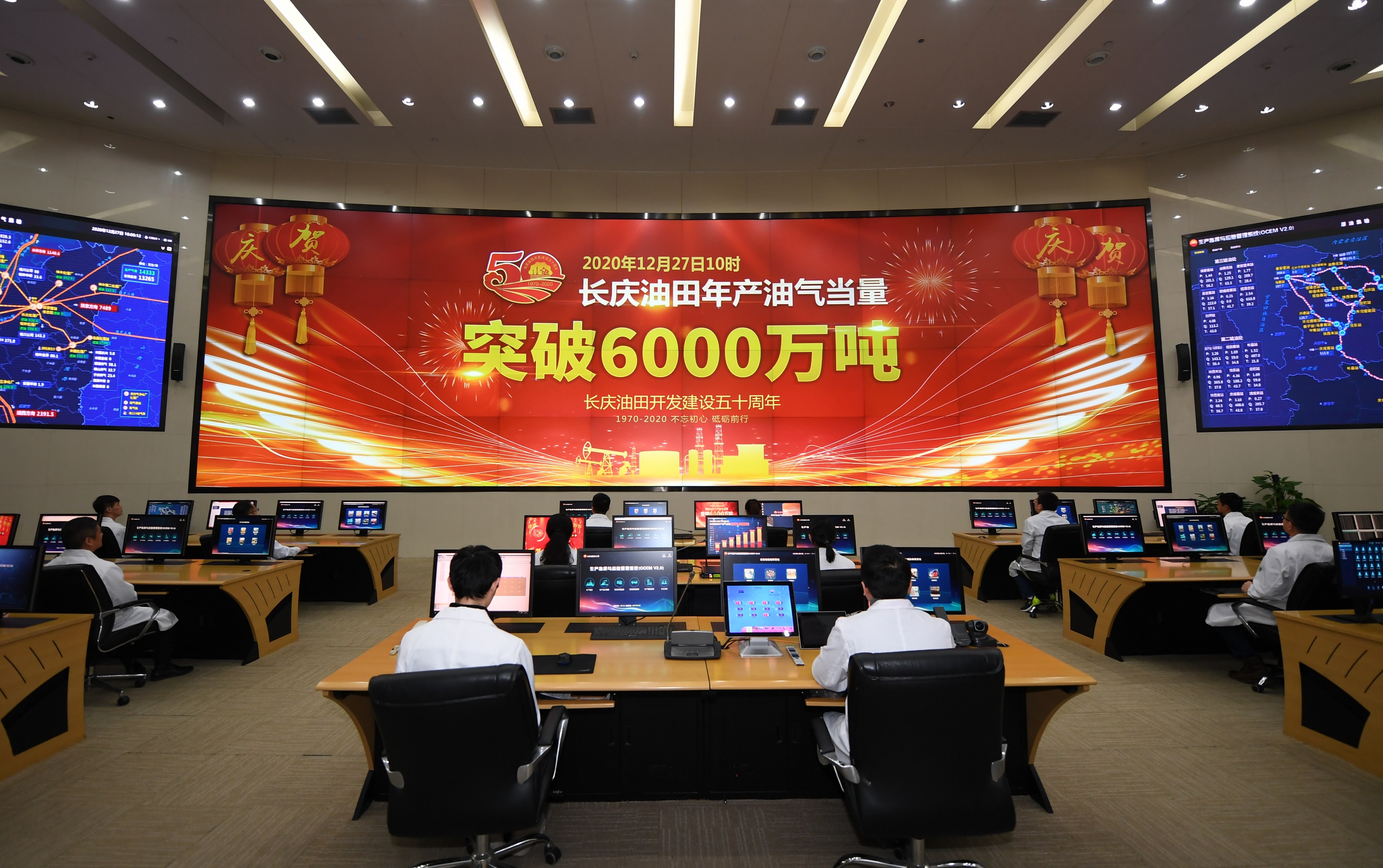 12月27日,在中国石油长庆油田生产指挥中心,数字化显示屏显示年产油气当量突破6000万吨。记者李一博摄