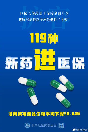 【#权威快报#|医保目录扩容!#新上市抗癌药以全球最低价上架#】2020年国家医保目录调整结果28日出炉。119种新药被纳入医保,谈判成功的药品价格平均下降50.64%。多个新上市抗癌药以全球最低价“上架”。(记者:屈婷 海报设计:张晨光)
