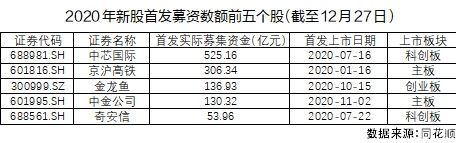 就个股情况而言,同花顺数据显示,今年上市的389只新股中,中芯国际首发实际募集资金数额暂列第一,为525.16亿元。京沪高铁、金龙鱼、中金公司3股的首发实际募集资金额也都超过百亿元,分别为306.34亿元,136.93亿元,130.32亿元,这四只个股实际首募规模占年内新股首募总额的比例达到了23.7%。