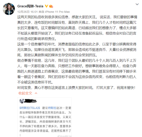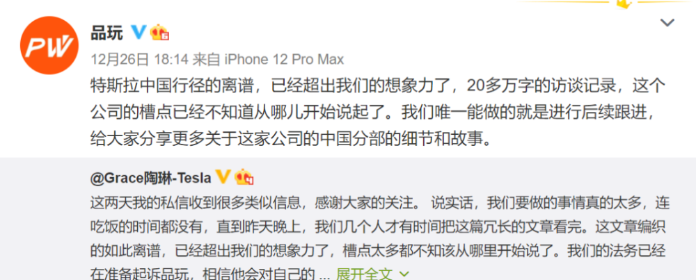 12月26日下午4时,特斯拉对外事务副总裁陶琳在微博回应上述文章称,“这文章编织如此离谱,已经超出我们的想象力了,槽点太多都不知该从哪里开始说了。我们的法务已经在准备起诉品玩,相信他会对自己的言行所造成的影响承担责任。”