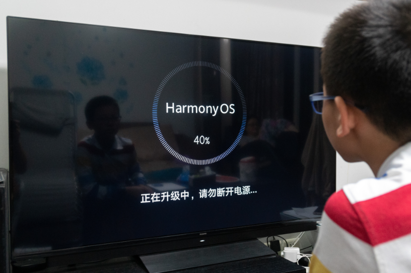 ▲2020年9月18日,上海,一位年轻人在一台华为智慧屏电视前等待鸿蒙系统的版本升级。图/IC photo