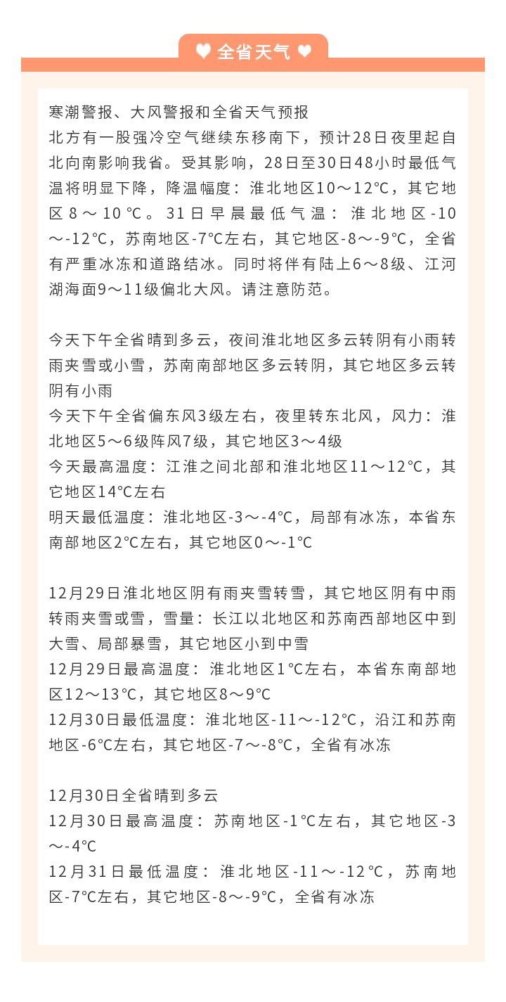 北方有一股强冷空气继续东移南下,预计28日夜里起自北向南影响江苏省。受其影响,28日至30日48小时最低气温将明显下降,降温幅度:淮北地区10~12℃,其他地区8~10℃。31日早晨最低气温:淮北地区-10~-12℃,苏南地区-7℃左右,其他地区-8~-9℃,江苏全省有严重冰冻和道路结冰。同时将伴有陆上6~8级、江河湖海面9~11级偏北大风。请注意防范。