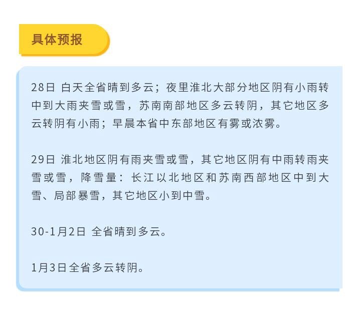 今天(28日)下午江苏省晴到多云,夜间淮北地区多云转阴有小雨转雨夹雪或小雪,苏南南部地区多云转阴,其他地区多云转阴有小雨。今天下午江苏省偏东风3级左右,夜里转东北风,风力:淮北地区5~6级阵风7级,其他地区3~4级。
