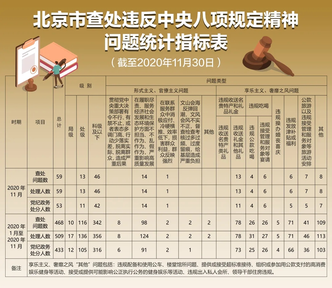 日前,北京市纪委监察委公布2020年1至11月查处违反中央八项规定精神问题统计指标表。截至11月30日,北京市累计查处违反中央八项规定精神问题468个,处理509人,其中局级17人、处级136人、科级及以下356人。