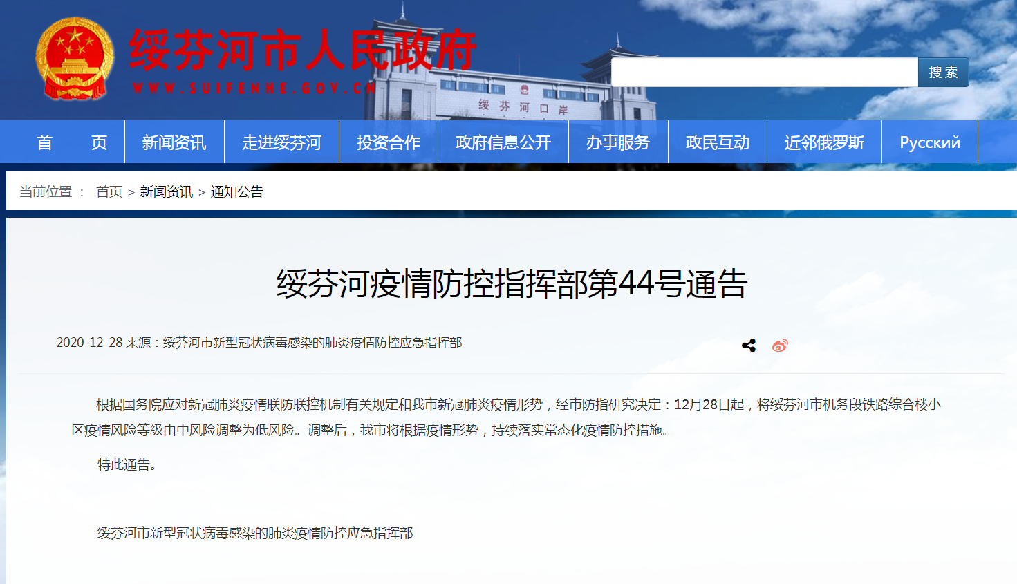 根据国务院应对新冠肺炎疫情联防联控机制有关规定和绥芬河市新冠肺炎疫情形势,经绥芬河市防指研究决定:12月28日起,将绥芬河市机务段铁路综合楼小区疫情风险等级由中风险调整为低风险。调整后,绥芬河市将根据疫情形势,持续落实常态化疫情防控措施。