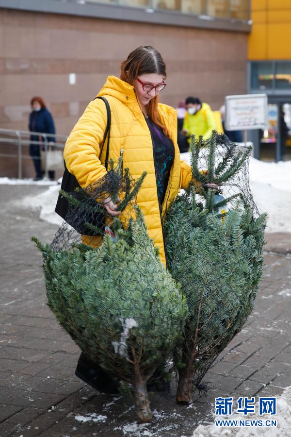 12月27日,在俄罗斯首都莫斯科,人们搬运刚买到的新年枞树。