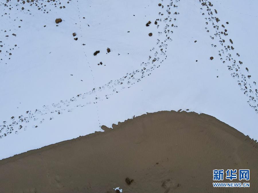 这是12月27日拍摄的雪后野生动物留下的脚印(无人机照片)。