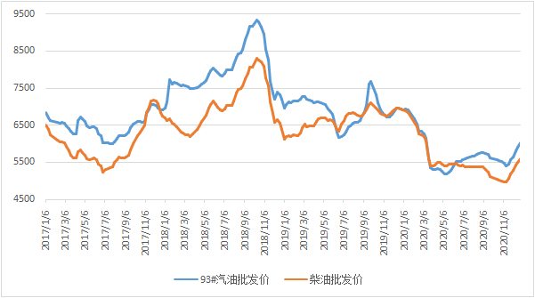 图表1:国内汽柴油批发价格走势图(单位:元/吨)