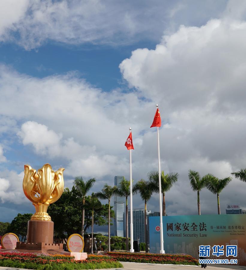 国家安全法的宣传板竖立在香港金紫荆广场醒目位置(7月1日拍摄)。新华社记者 李钢 摄