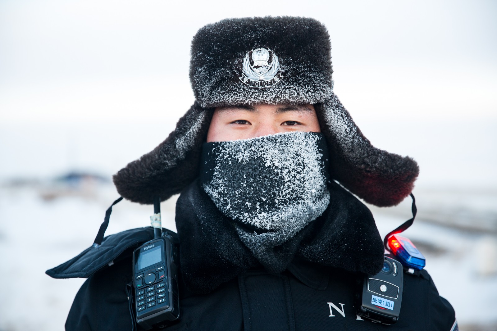 图为12月28日,二连出入境边防检查站民警呼吸的雾气凝结成冰霜挂在帽子和防寒面罩上。