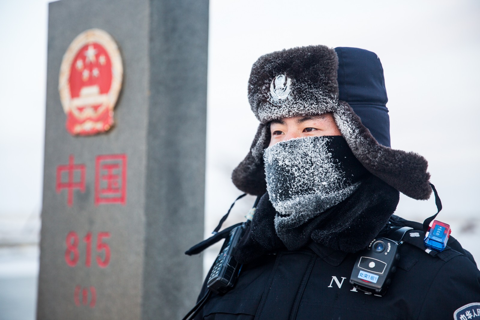 图为12月28日,二连出入境边防检查站民警在中蒙边境815号界碑前执勤,民警帽子和防寒面罩上挂满冰霜。