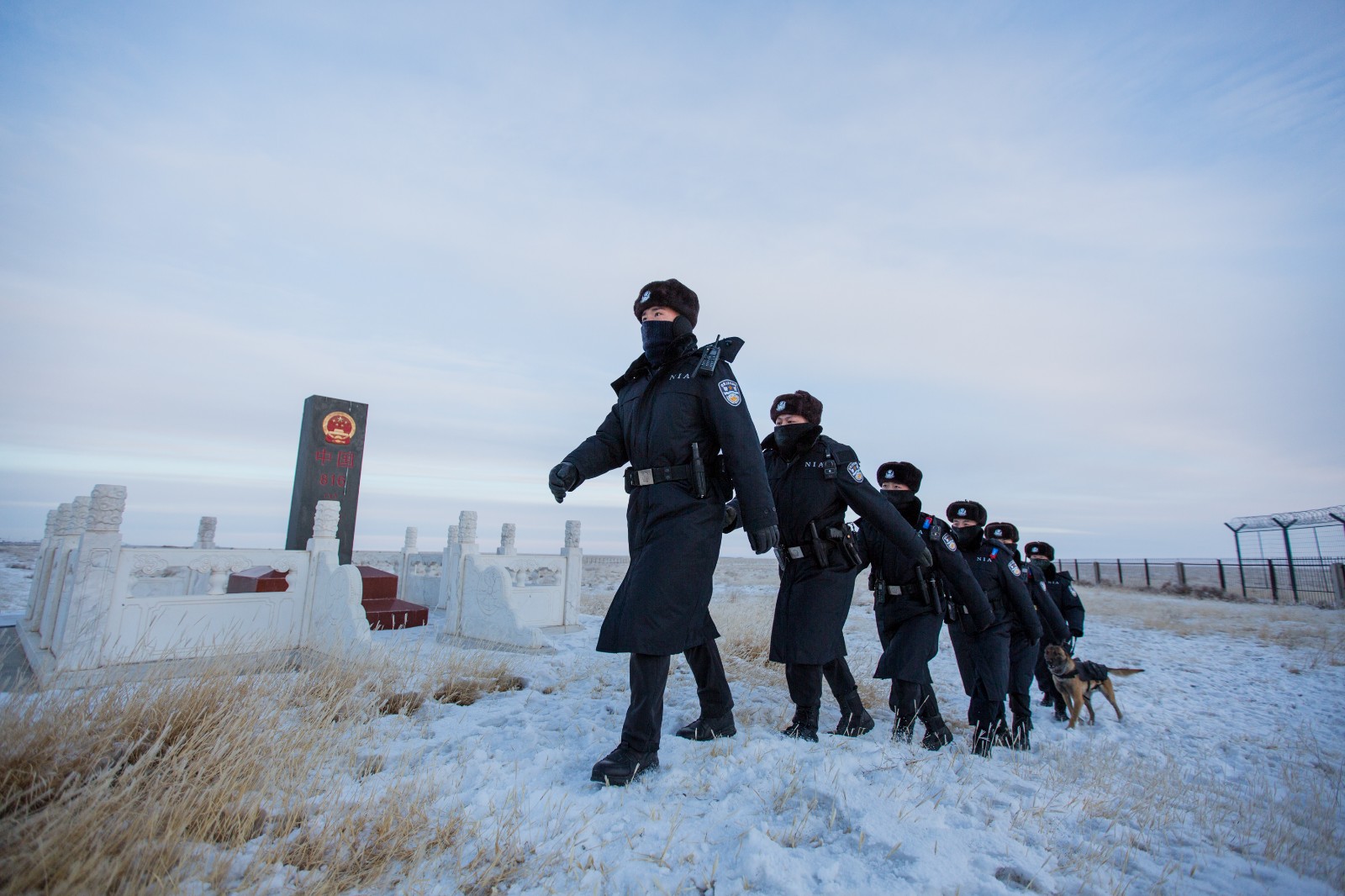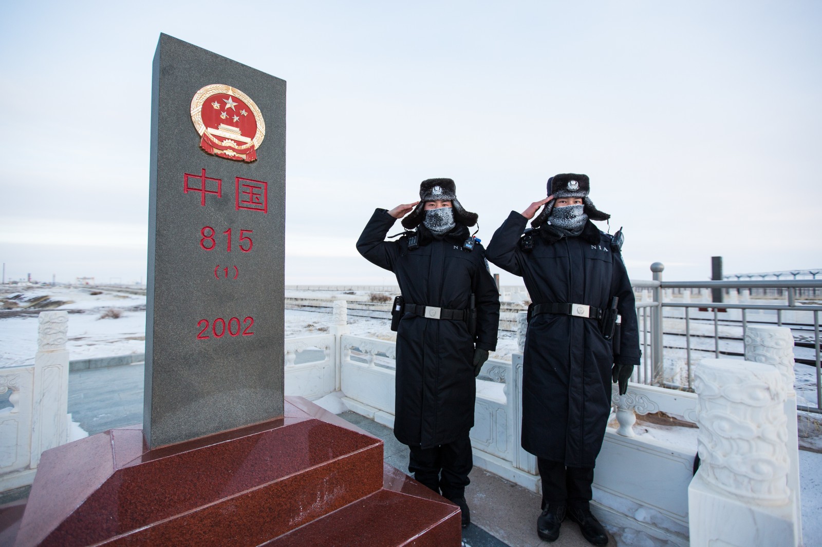 图为12月28日,二连出入境边防检查站民警在中蒙边境815号界碑前执勤,民警呼吸的雾气凝结成冰霜挂在帽子和防寒面罩上。