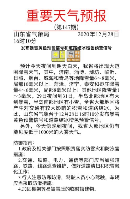 记者从山东省气象局了解到,预计今天(12月28日)夜间到明天白天,山东省将出现大范围降雪天气。其中,济南、淄博、潍坊、临沂、日照、烟台、威海和青岛等地降雪量6~8毫米,局部10毫米以上;菏泽、济宁、泰安和枣庄降雪量4~6毫米,局部8毫米以上;其他地区降雪量1~3毫米。29日夜间到31日,半岛北部地区有大到暴雪,半岛南部地区有小雪。全省大部地区将产生对交通有较大影响的积雪和道路结冰。为此,山东省气象台于12月28日16时10分发布暴雪黄色预警信号和道路结冰橙色预警信号。