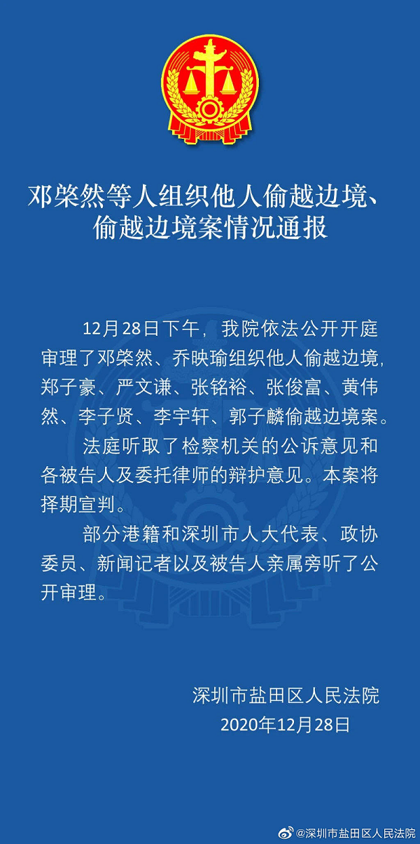 12月28日下午,我院依法公开开庭审理了邓棨然、乔映瑜组织他人偷越边境,郑子豪、严文谦、张铭裕、张俊富、黄伟然、李子贤、李宇轩、郭子麟偷越边境案。
