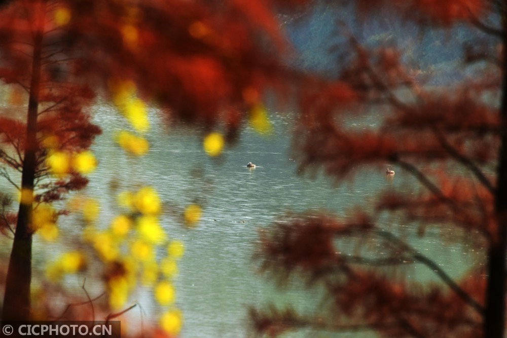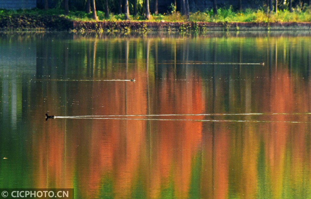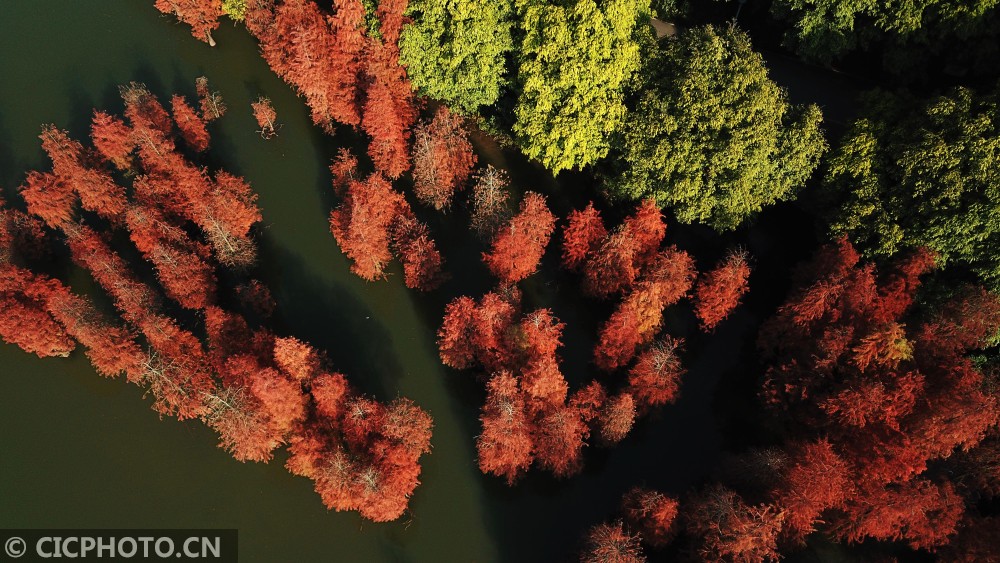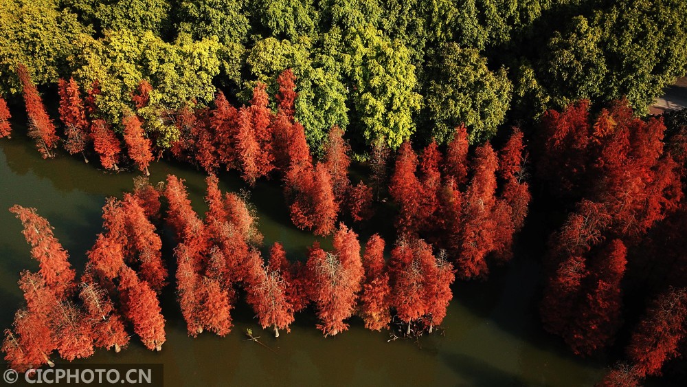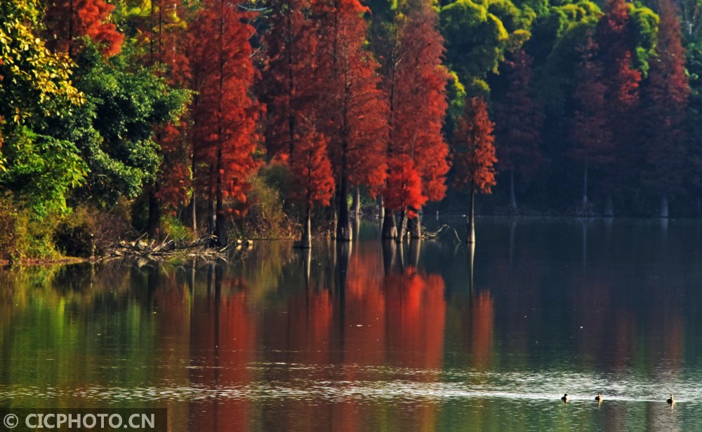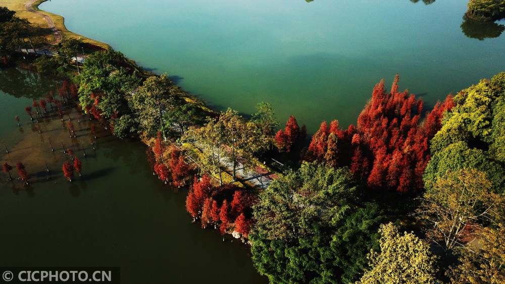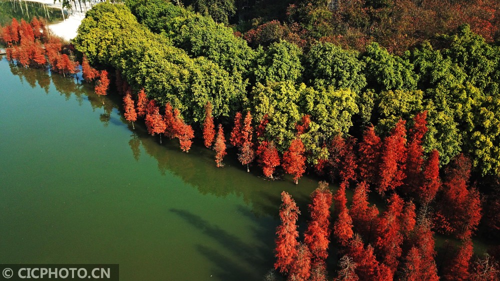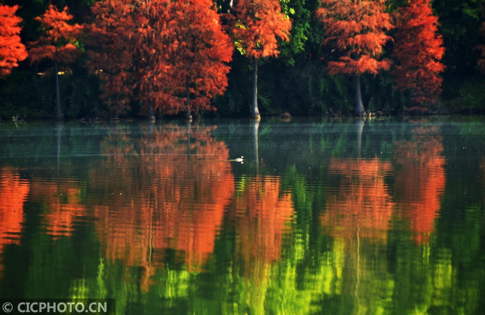 仲冬时节,广西壮族自治区南宁市武鸣区花花大世界的红杉林进入最佳观赏期。寒气凛冽的早晨,在阳光和清澈的湖水映衬下,水中的红杉林更显得殷红通透。