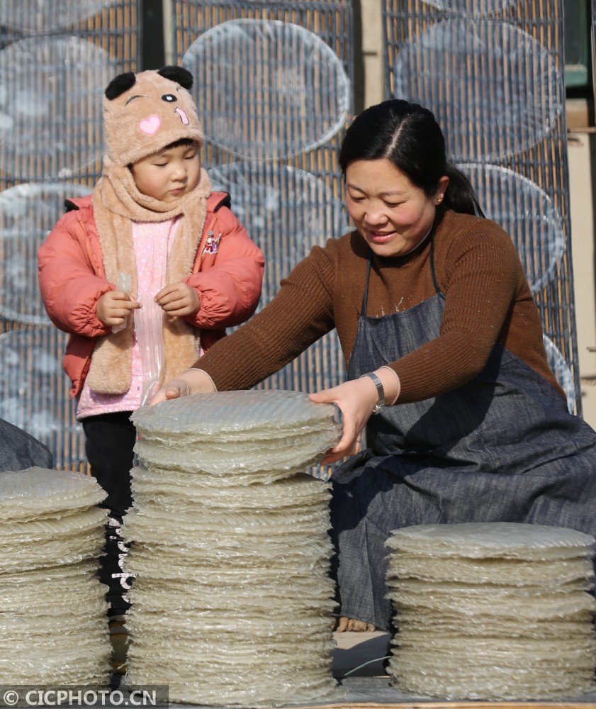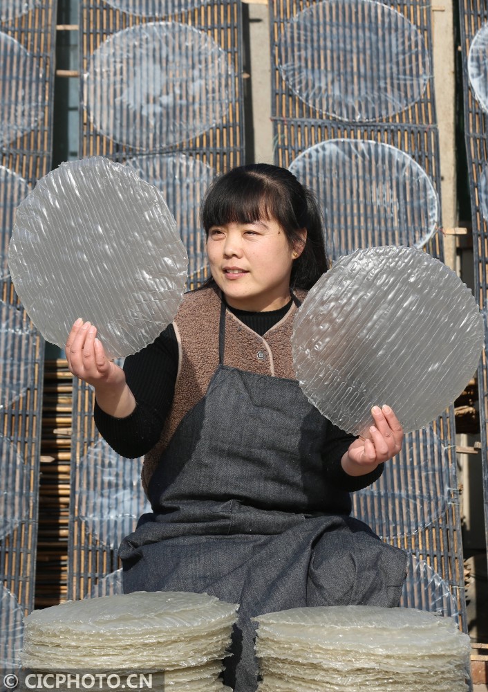 ↑2020年12月25日,山东省临沂市河东区汤头街道西安乐村,农妇在整理晾晒好的红薯粉皮。CICPHOTO/王彦冰 摄