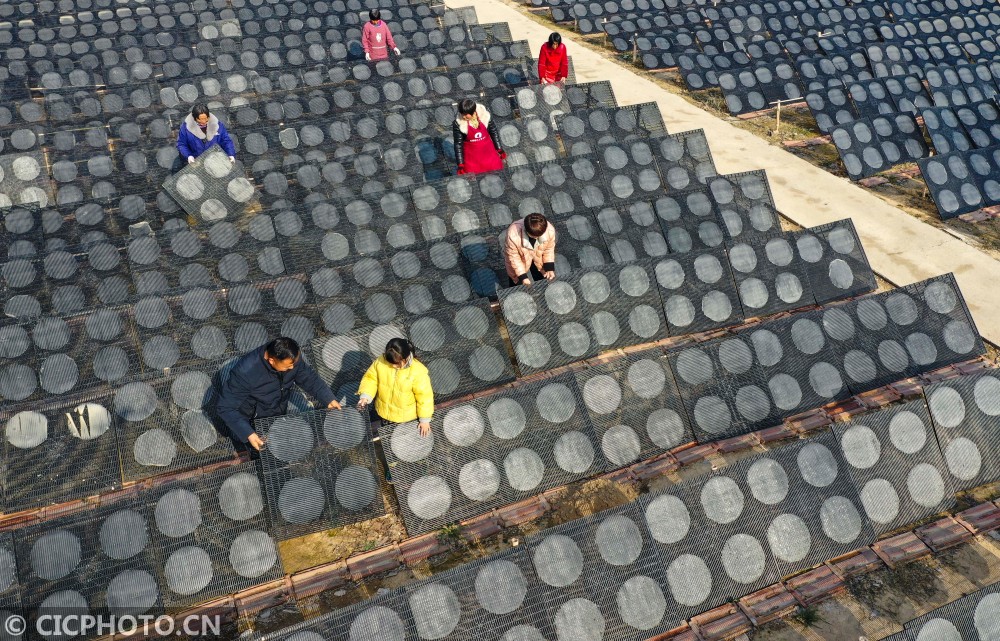 ↑2020年12月19日,安徽省亳州市谯城区芦庙镇王楼村一家庭农场的农民在晾晒红薯粉皮。CICPHOTO/刘勤利 摄