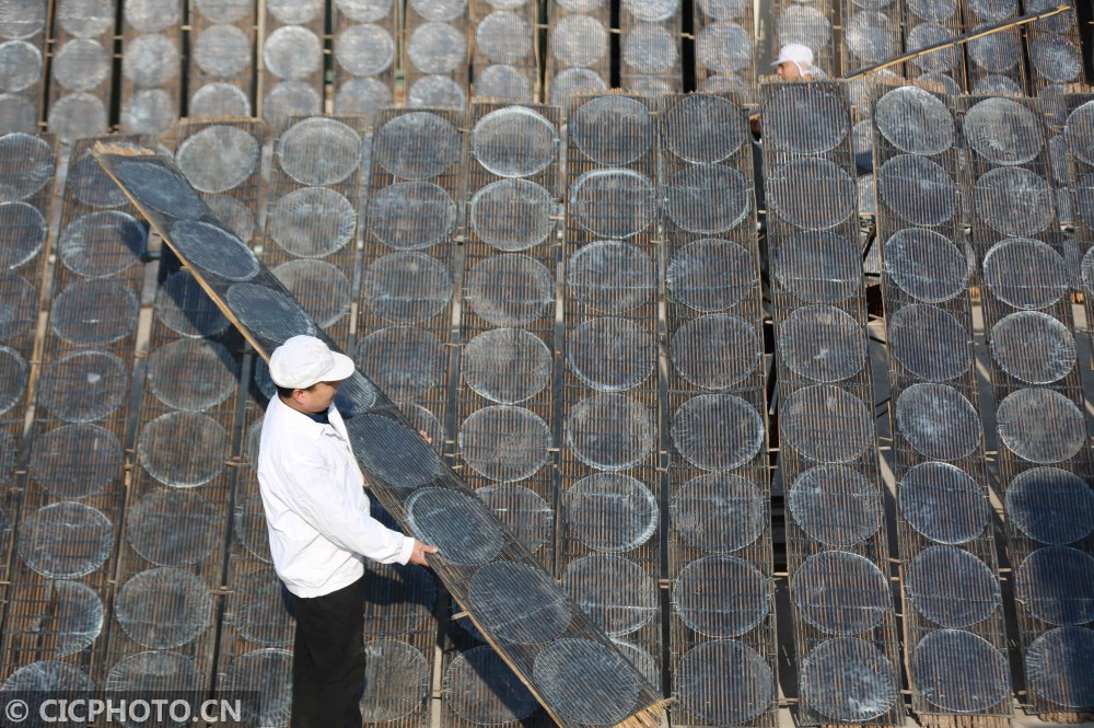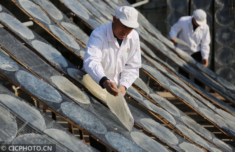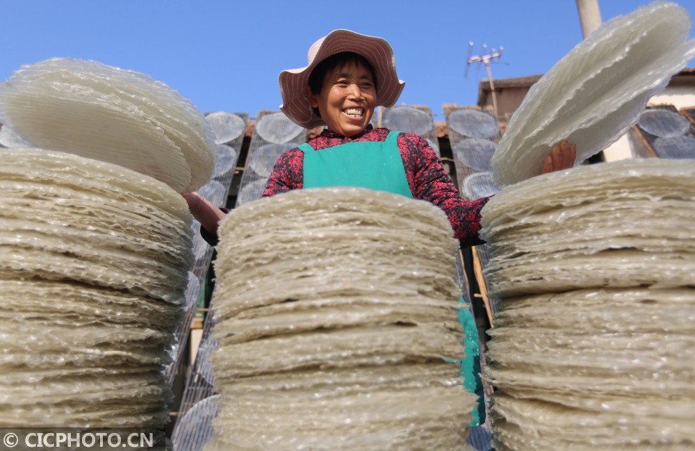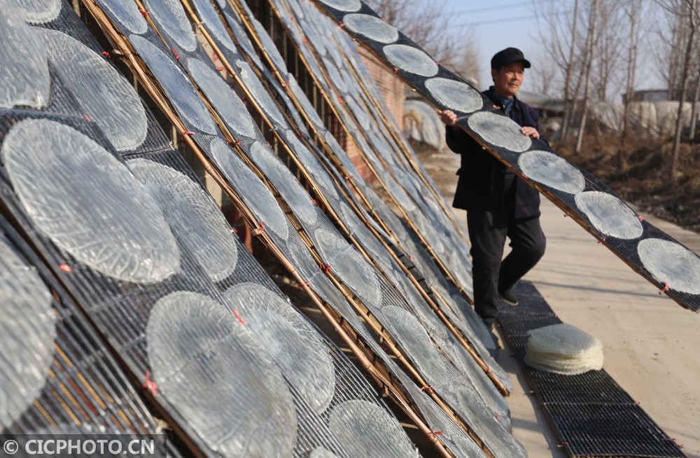 ↑2020年12月25日,山东省临沂市河东区汤头街道西安乐村,农民在收获晾晒好的红薯粉皮。CICPHOTO/王彦冰 摄