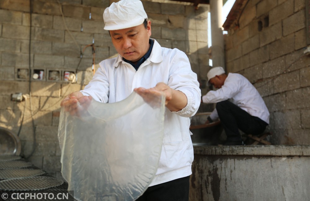 ↑2020年12月25日,山东省临沂市河东区汤头街道西安乐村,农民在制作红薯粉皮。CICPHOTO/王彦冰 摄