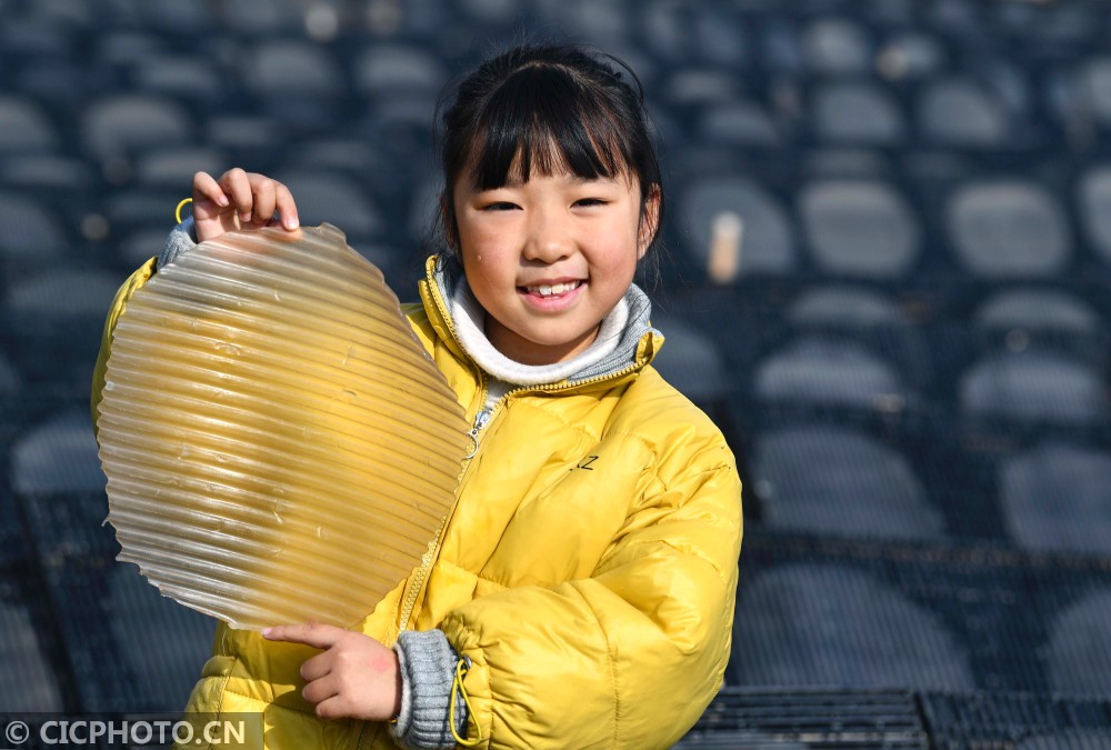 ↑2020年12月19日,安徽省亳州市谯城区芦庙镇王楼村,一名小女孩展示晾晒的红薯粉皮。CICPHOTO/刘勤利 摄