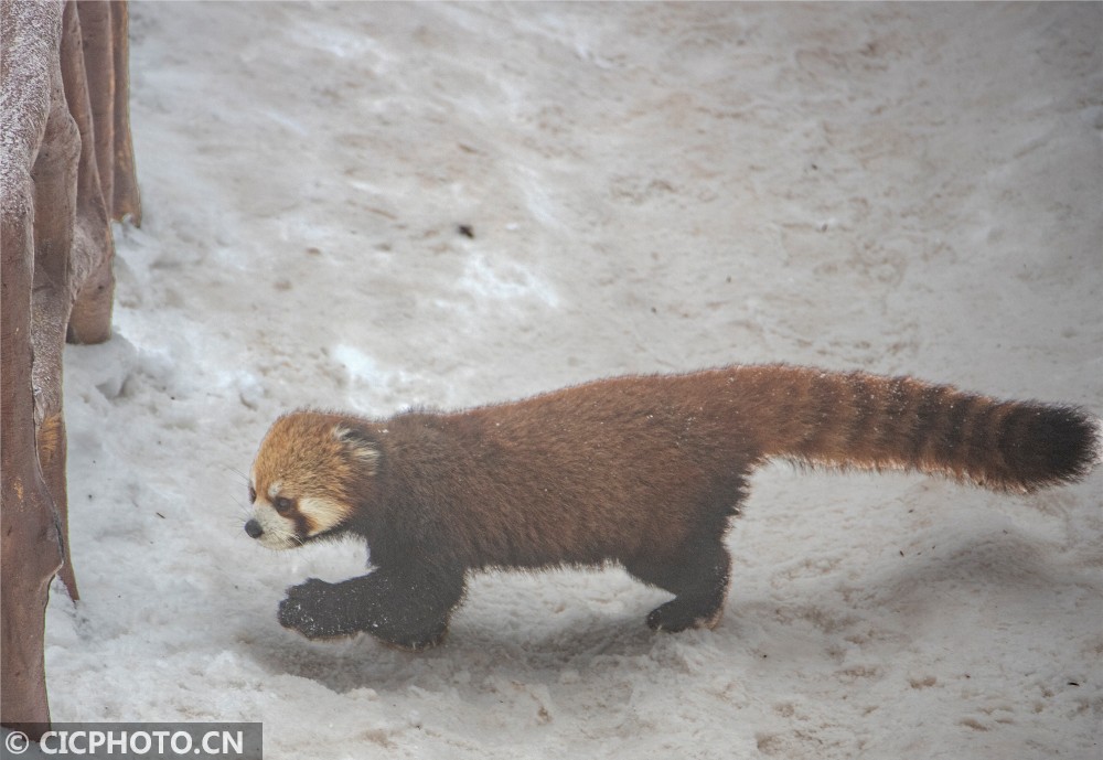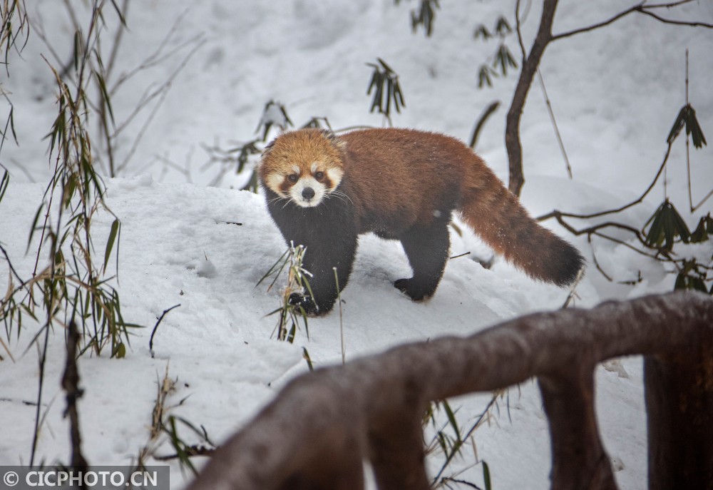以上图片:2020年12月24日,四川省眉山市洪雅县瓦屋山国家森林公园内,象耳寺附近栈道旁,野生小熊猫在雪地里觅食。CICPHOTO/刘国兴 摄