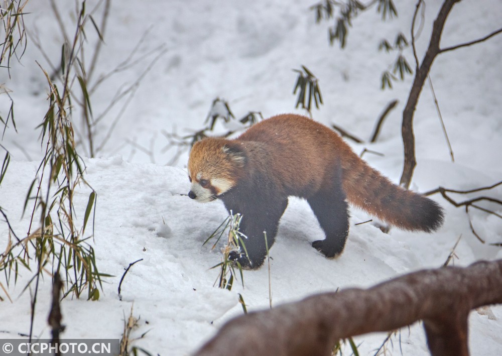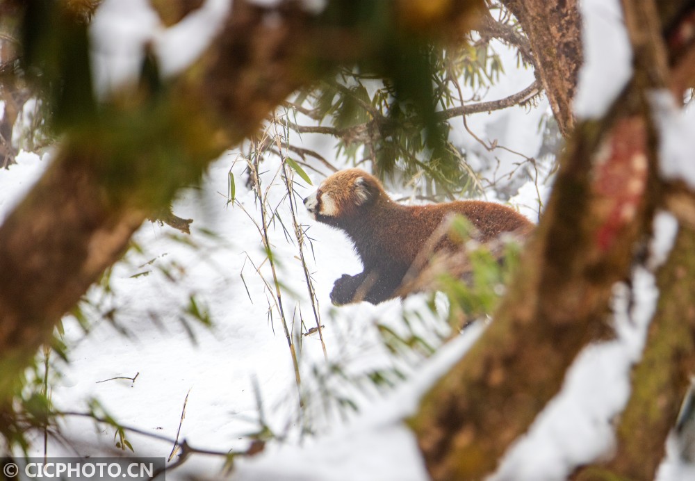 仲冬时节,四川省眉山市洪雅县瓦屋山国家森林公园内,象耳寺附近栈道旁,偶遇在雪地里觅食的国家二级保护动物——小熊猫。