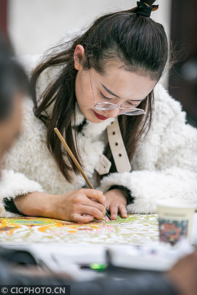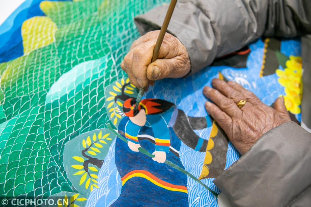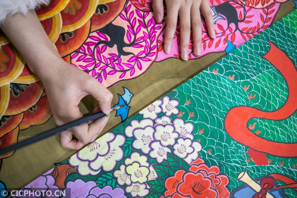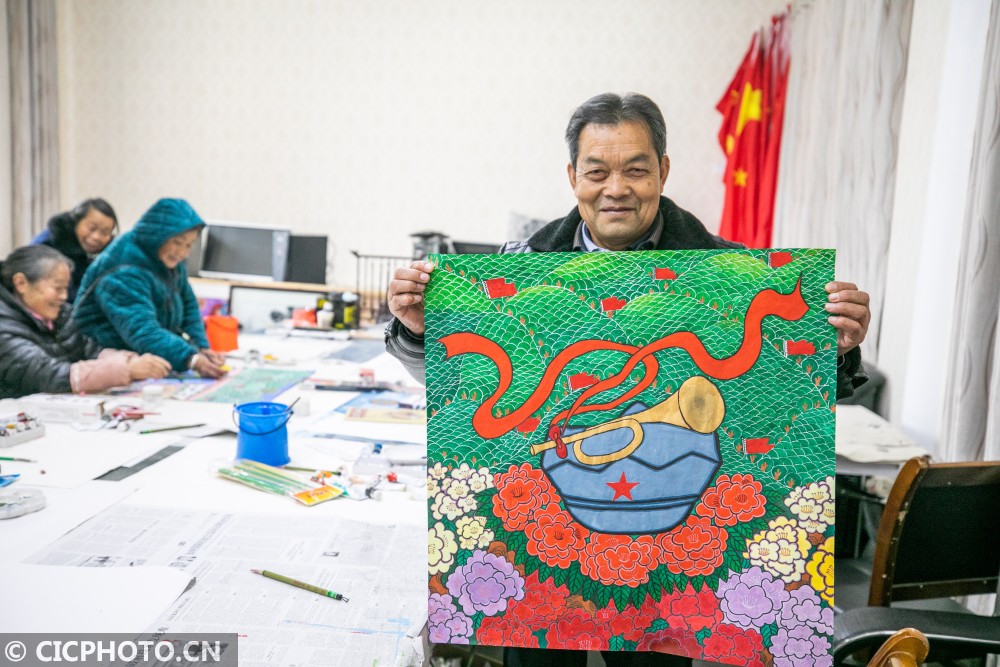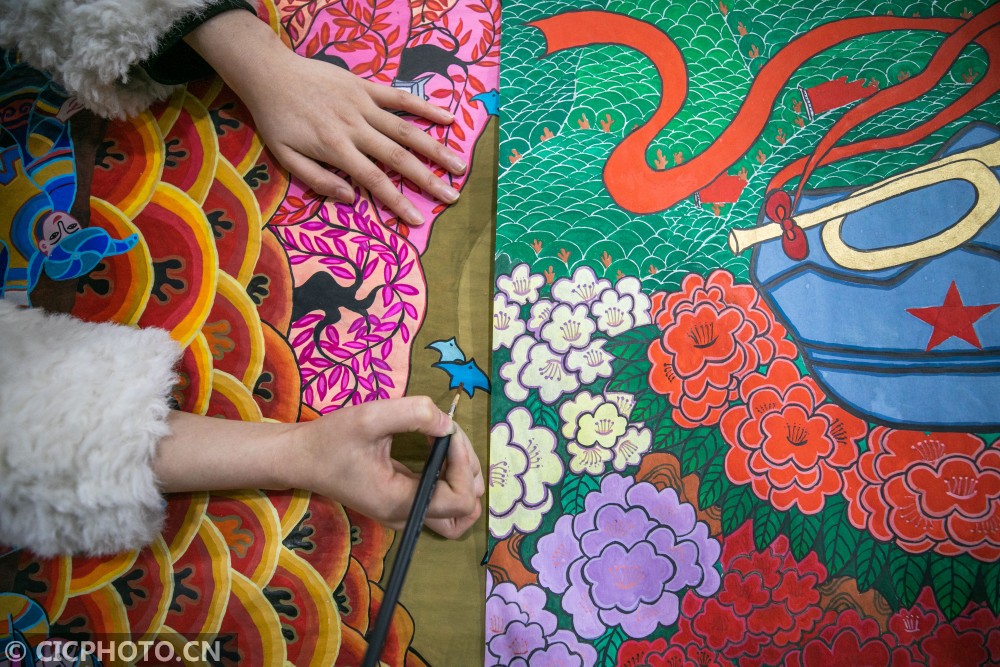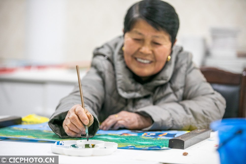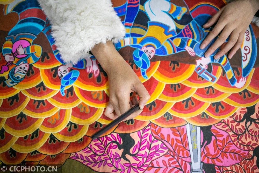 ↑2020年12月24日,农民画画师在贵州省毕节市大方县农民画院绘制迎新年作品。CICPHOTO/罗大富 摄