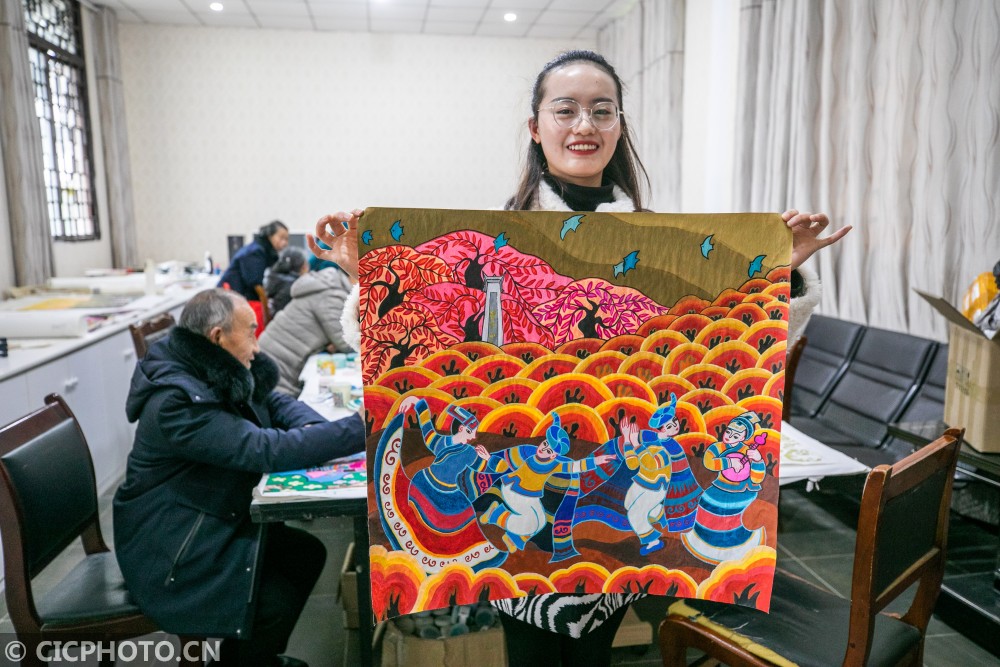 ↑2020年12月24日,农民画画师在贵州省毕节市大方县农民画院展示自己绘制的迎新年作品。CICPHOTO/罗大富 摄