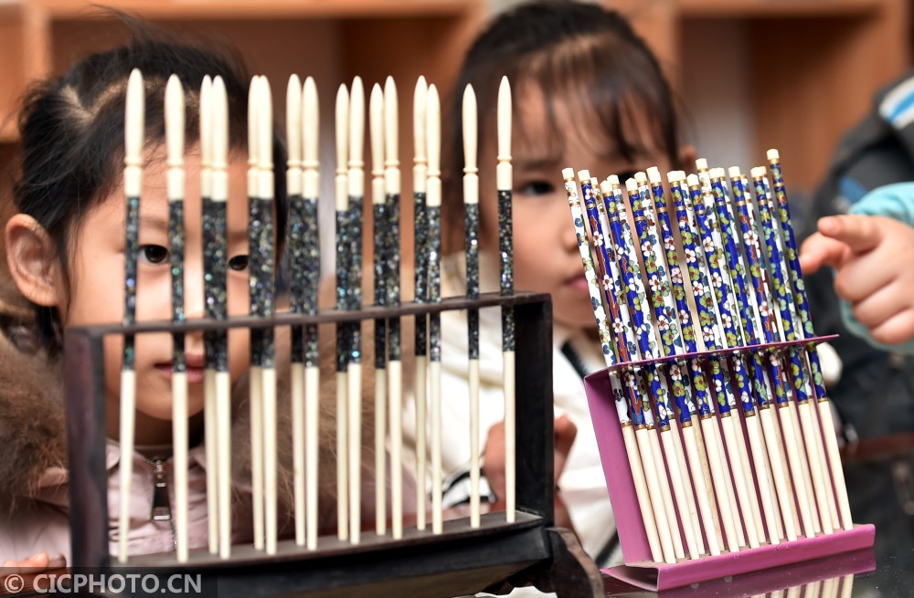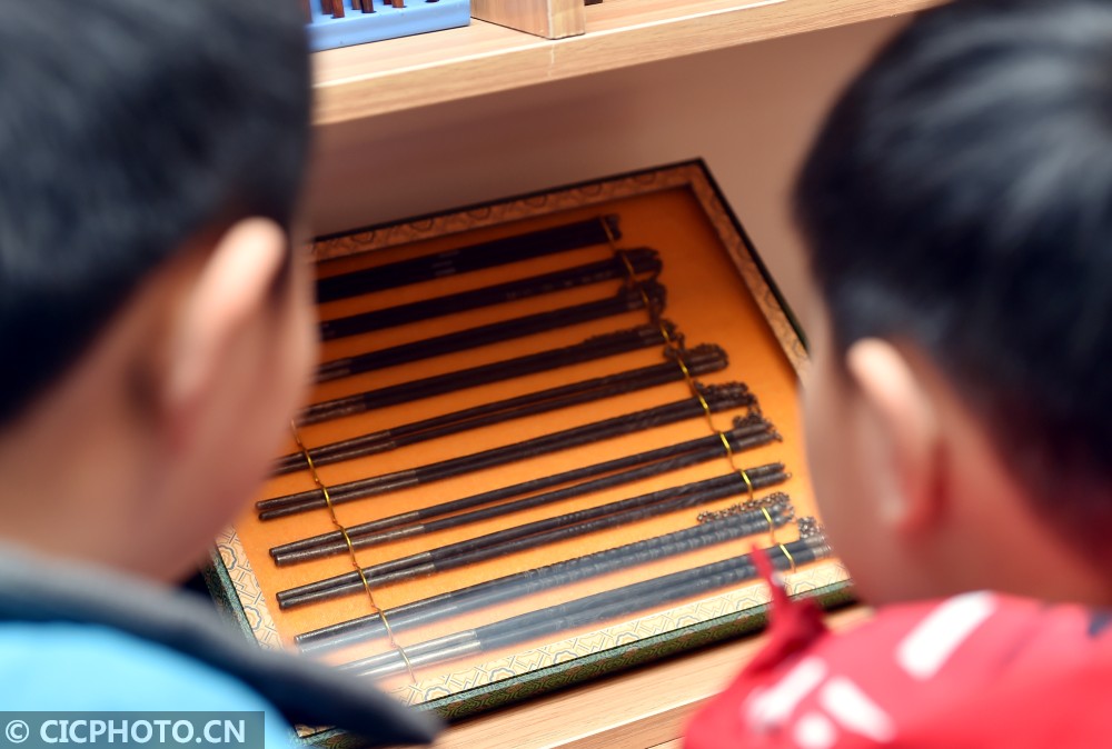 ↑2020年12月24日,小朋友在江苏省扬州市汶河街道旌忠寺社区开展的“筷箸文化节”活动上参观筷箸文化藏品。CICPHOTO/庄文斌 摄