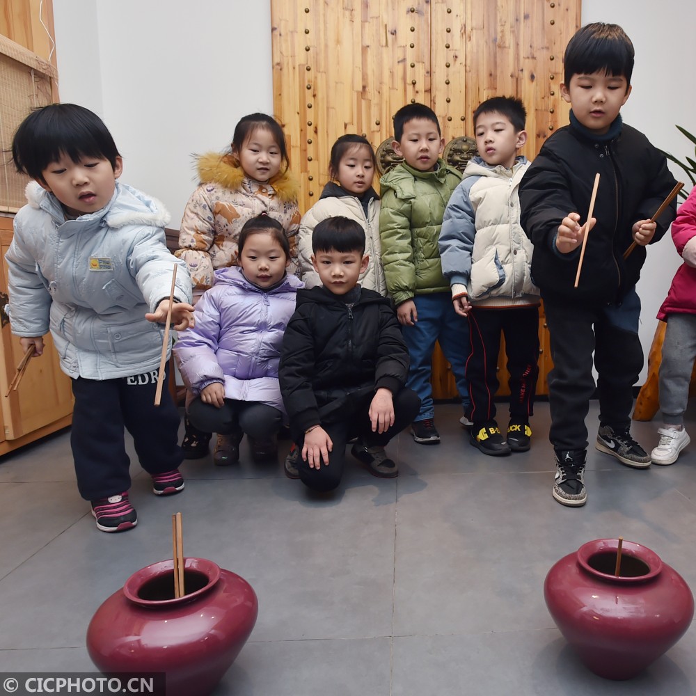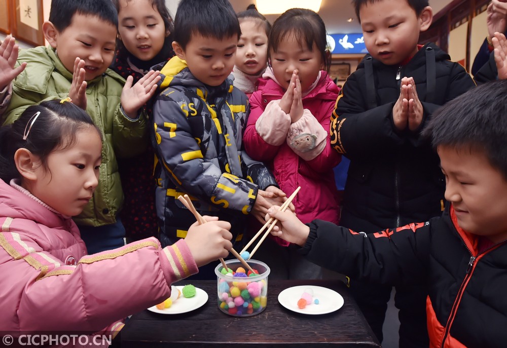 ↑2020年12月24日,小朋友在江苏省扬州市汶河街道旌忠寺社区开展的“筷箸文化节”活动上体验“筷子投壶”游戏。CICPHOTO/庄文斌 摄