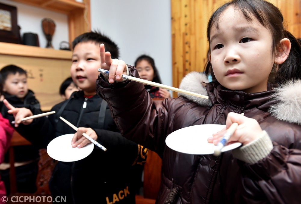 ↑2020年12月24日,小朋友在江苏省扬州市汶河街道旌忠寺社区开展的“筷箸文化节”活动上通过筷子和碟子体验表演“扬州清曲”。CICPHOTO/庄文斌 摄
