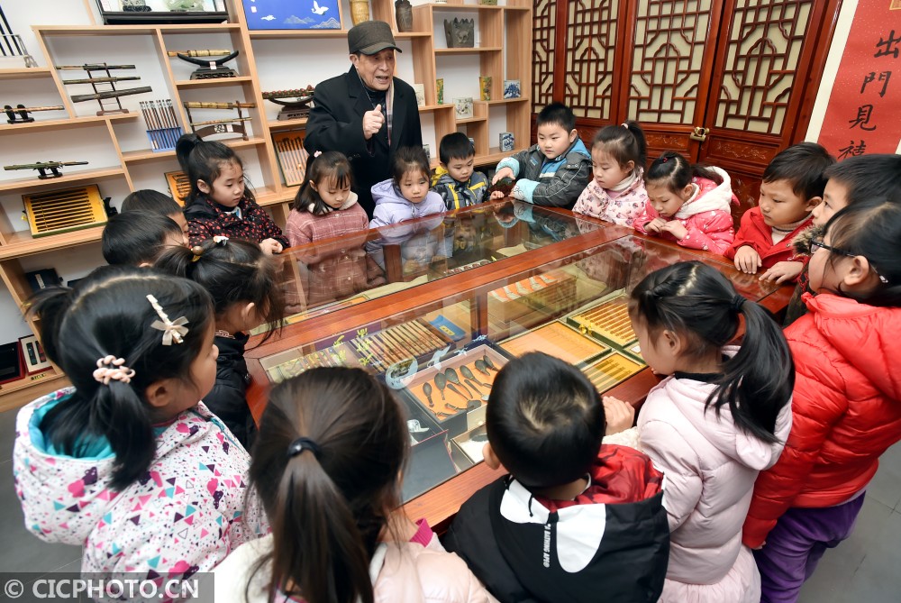 ↑2020年12月24日,民间收藏者在江苏省扬州市汶河街道旌忠寺社区开展的“筷箸文化节”活动上向小朋友讲解“筷箸文化”知识。CICPHOTO/庄文斌 摄