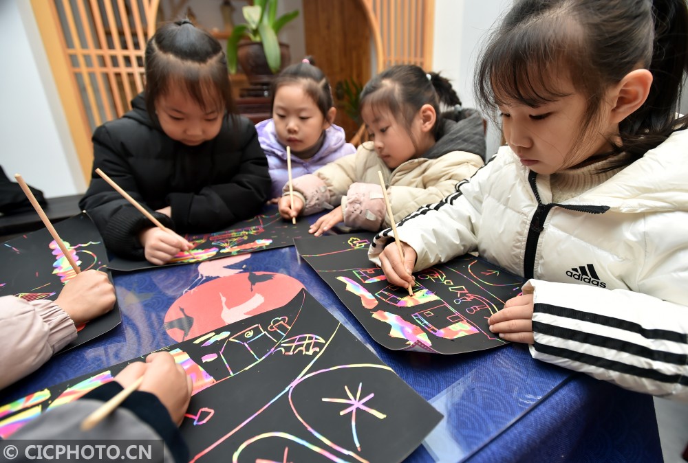 ↑2020年12月24日,小朋友在江苏省扬州市汶河街道旌忠寺社区开展的“筷箸文化节”活动上创作“筷子刮画”绘画作品。CICPHOTO/庄文斌 摄